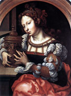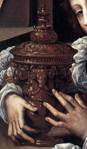 In many ways, Mary Magdalen is the most accessible of the female saints, a real human being, unlike the lofty, remote and far too pure and unreal Virgin Mary. Part of her appeal, to be sure, resides in her embodying a fundamental female identity, which may be very ancient. Her principal attribute is the ointment pot or jar. The vessel, however, can also appear as a vase or a monstrance.