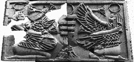 This type of winged figure can also be seen in Egypt where wings are the attribute of a number of deities. They appear most frequently, however, on goddesses, usually in a protective context, such as Isis and Nephthys, and Selket and Neith. These four goddesses are shown, for example, positioned at the corners of royal sarcophagi in the Eighteenth Dynasty with their winged arms outstretched along each side to protect the body of the king. Winged figures, both male and female, also appear performing a similar protective function in Assyria where they are sometimes shown guarding a sacred tree or column.