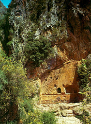 ![]() The Castalian Spring The sacred spring of Delphi lies in the ravine of the Phaedriades. The preserved remains of two monumental fountains that received the water from the spring date to the Archaic period and the Roman era. The later one is cut in the rock and has niches cut high in the cliff, which probably held the offerings to the Nymph Castalia. Bibliography: