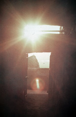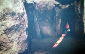 The entrance, in front of which is a massive curbstone (10 feet long, 4 feet high) carved with spirals and lozenges, incoporates a roof box which allows the sun, at sunrise on the morning of the winter solstice on December 21, to penetrate the full length of the interior passage all the way to the main chamber. A similar carefully calculated phenomenon is also found at Abu Simbel in Egypt.