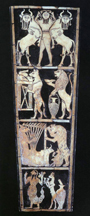 MEDIUM: Wood with shell inlaid in bitumen CITY: Ur CULTURE: Sumerian DATE: c. 2550-2400 BCE