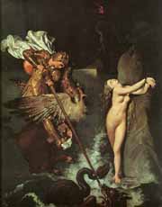 (image source: Carol Gerten) Jean-Auguste-Dominique Ingres Roger Saving Angelica, 1839 Some sea monsters, who remained located in a single place, where they prayed upon passing shipping, were represented as female. The most famous are Scylla and Charybdis, who, in Greek mythology, were two immortal and irresistible monsters whom Odysseus encountered in his wanderings, and were later localized in the Strait of Messina (between Italy and Sicily). The mysterious depths of the ocean, and the potentially destructive aspects of the sea, were also personified in female forms, such Mermaids and Sirens, the latter also memorably encountered by Odysseus. Many traditions also contain stories about devastating floods. The Babylonian epic of Gilgamesh tells of an apocalyptic flood, from which was almost certainly derived the Old Testament story of Noah and the flood told in Genesis. The biblical flood is an example of God using water to destroy the wicked and evil-doers.